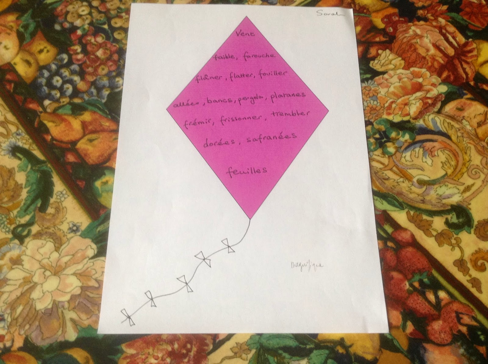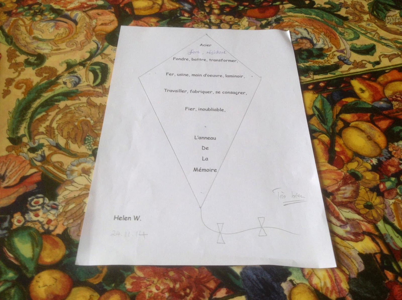 Several students took some of the words of the song and wrote a poem in the shape of the kite (un cerf-volant) using some related adjectives ( des adjectifs), verbs ( des verbes) and nouns ( des noms).