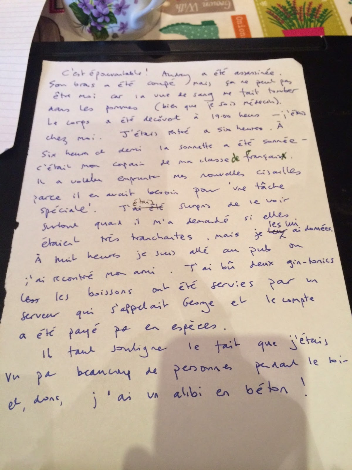 Audrey asked her students in her Thursday French class to write a story about a murder ( un meurtre) or a premedited murder ( un assassinat) and who did her students choose to kill? Their French teacher!! ( Leur professeur de français!)